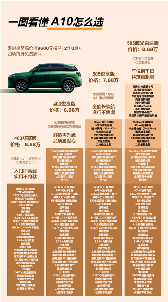 零跑 A10 一共四个版本,我给大家捋清楚每个版本的差异,直接对号入座就行: